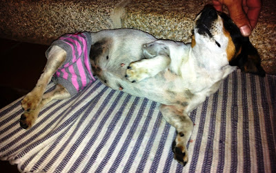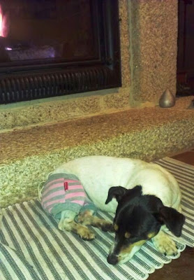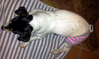 Tenemos período de celo para Luna. Las mayores pérdidas de sangre ocurren durante la primera semana, así que para evitar manchas en casa, existen en el mercado todo tipo de inventos. Uno de ellos es utilizar braguitas de tejido con dos aberturas: una para introducir una compresa canina y otra para sacar la cola. La que tenemos para Luna, y que podéis ver en las fotos, aparte de la abertura para la cola, tiene otra abertura para las patas, de modo que se sienta cómoda. A pesar de ello, Luna apenas la utiliza, ya que sólo en días de frío extremo o en momentos puntuales entra en casa. Ella prefiere campar a sus anchas en la finca, en la que puede correr, jugar con la pelota, investigar todo sonido que se le presenta… Ah, y una advertencia, el uso de braguita no impide la monta del macho, por lo tanto, precaución en estos días, con y sin braguita.
