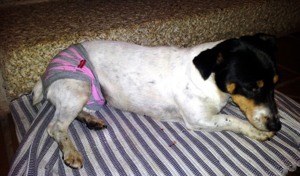 Tenemos período de celo para Luna. Las mayores pérdidas de sangre ocurren durante la primera semana, así que para evitar manchas en casa, existen en el mercado todo tipo de inventos. Uno de ellos es utilizar braguitas de tejido con dos aberturas: una para introducir una compresa canina y otra para sacar la cola. La que tenemos para Luna, y que podéis ver en las fotos, aparte de la abertura para la cola, tiene otra abertura para las patas, de modo que se sienta cómoda. A pesar de ello, Luna apenas la utiliza, ya que sólo en días de frío extremo o en momentos puntuales entra en casa. Ella prefiere campar a sus anchas en la finca, en la que puede correr, jugar con la pelota, investigar todo sonido que se le presenta… Ah, y una advertencia, el uso de braguita no impide la monta del macho, por lo tanto, precaución en estos días, con y sin braguita.