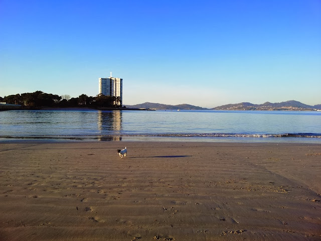 We love the beach. Even in winter. Pinon, Luna and Herba have a great time there. Yesterday Lunan even got into the water, although it was very cold! but whatever just to retrieve her beloved ball 🙂 The beach we went, O Vao in Vigo (Galicia, Spain), has been featured on numerous occasions in the blog because it is our point of reference for adrenaline release in short winter afternoons. And it is because of its proximity, size and quiet (just the opposite in summer). If you go there, we advise going well wrapped, since as the sun reveals is comfortable, but when it goes away (about 6am) the cold is killer! We leave you a graphic example of yesterday beach afternoon. We hope you enjoy it.