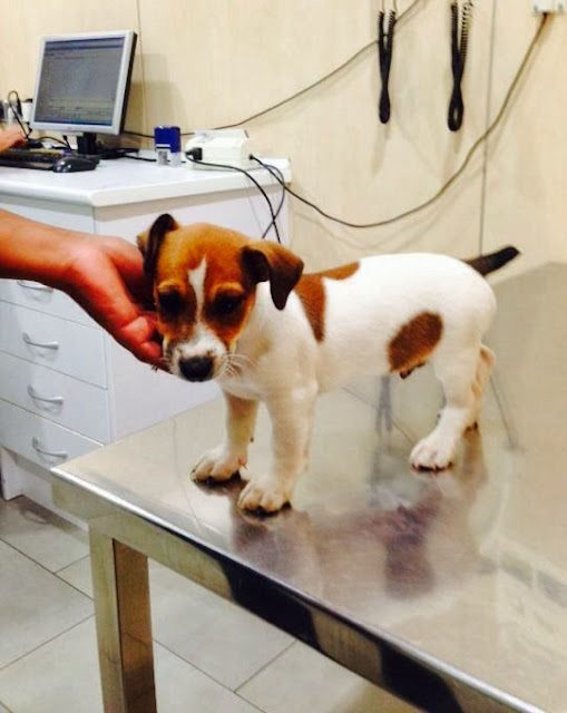 … y nos tocó la segunda vacuna. Bueno, concretamente le tocó a Piñón, y ya fue la semana pasada. Como en la ocasión anterior, con la primera vacuna (la Puppy) se portó muy bien y ni se enteró. La segunda vacuna del cachorro se pone aproximadamente cuando cumple los dos meses, se llama Tetravalente y lo protege de las siguientes enfermedades: parvovirus, moquillo, leptospirosis y hepatitis. Son cuatro enfermedades muy graves de las que nuestro perro tiene que estar protegido. Esta misma vacuna se repite un mes después. Esta vez no le hicimos foto a Piñón, pero nos enviaron esta foto de Niko (Peto) en su visita al veterinario tras su llegada a su nuevo hogar.