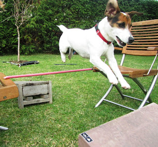 Here we have again a Laia’s agility demonstration. With a year just completed has vitality to spare, as you can see in the pictures … and also as you can see in the photos, to train our Jacks do not need professional elements. In our house we can improvise: a chair here, a stick over there … and show the world how far can get the ability of a Jack Russell!