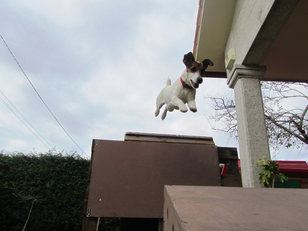 De nuevo tenemos una demostración de agility de Laia. Con un año recién cumplido tiene vitalidad de sobra, como podéis comprobar en las fotos… y como podéis observar también en las fotos, para entrenar a nuestros Jacks no es necesario tener elementos profesionales. En nuestra propia casa podemos improvisar: una silla por aquí, un palo por allá… y a enseñar al mundo hasta dónde puede llegar la habilidad de un Jack Russell!