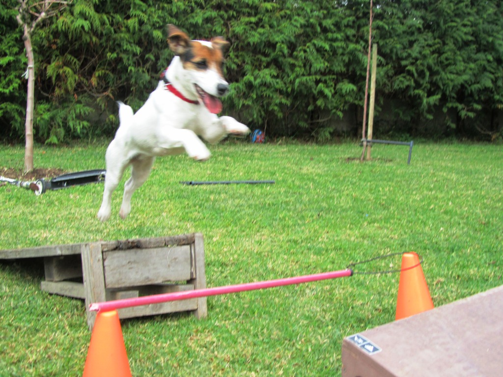 Here we have again a Laia’s agility demonstration. With a year just completed has vitality to spare, as you can see in the pictures … and also as you can see in the photos, to train our Jacks do not need professional elements. In our house we can improvise: a chair here, a stick over there … and show the world how far can get the ability of a Jack Russell!
